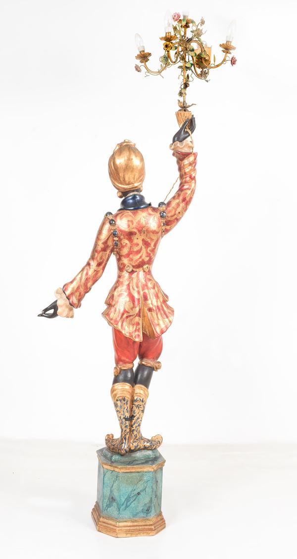Venetian Moretto in lacquered wood and painted in polychrome, with 5-light pinwheels with small ceramic flowers