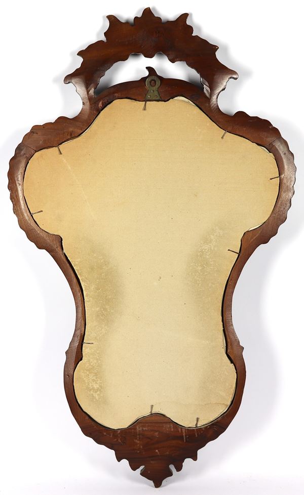Walnut-colored wooden arched mirror with carved friezes