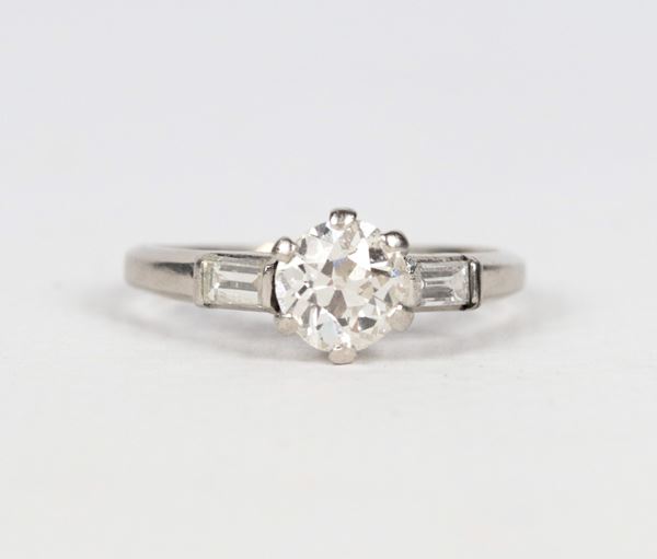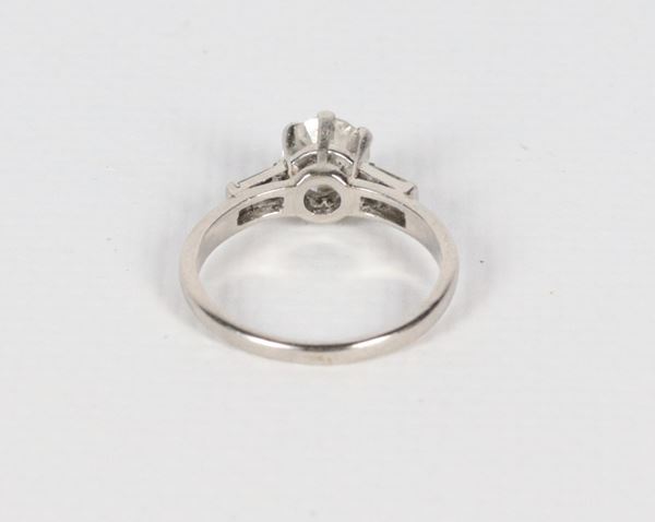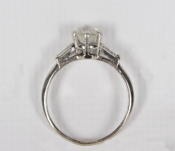 18kt white gold ring with central old cut diamond ct 0.70 approx. and two lateral diamond baguettes ct 0.10 approx. each, gold weight 4 gr approx. [..]