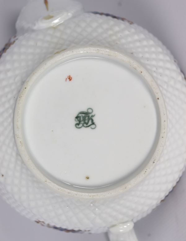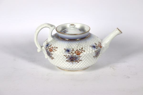 Antique teapot in honeycomb-worked enamelled porcelain, with multicoloured flower bouquet decorations on a white background