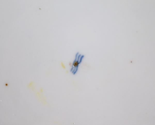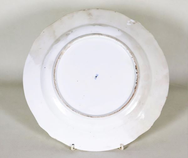 Antique white porcelain wall plate with painted decorations in relief with bird and flower motifs. The plate has defects and old restorations [..]