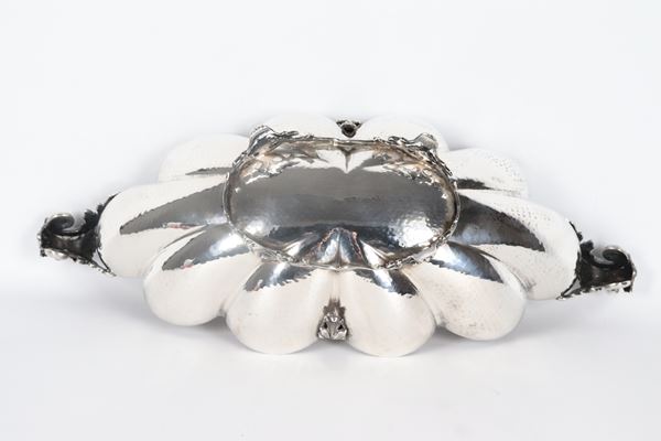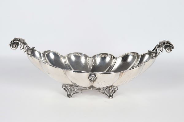 Boat-shaped centrepiece in chiseled and embossed silver, with arched edge and supported by four curved feet, gr. 720