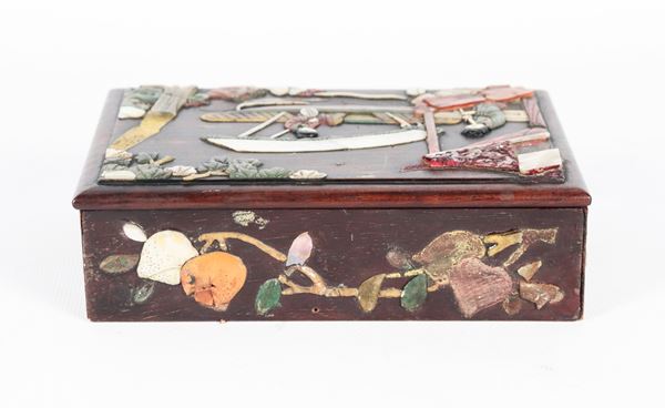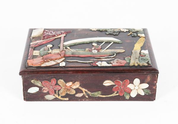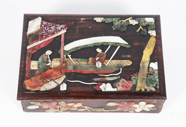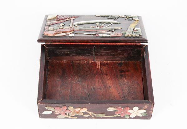 Chinese wooden box, with polychrome applications of motifs of oriental life scenes