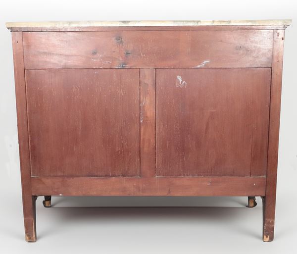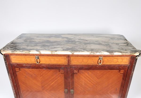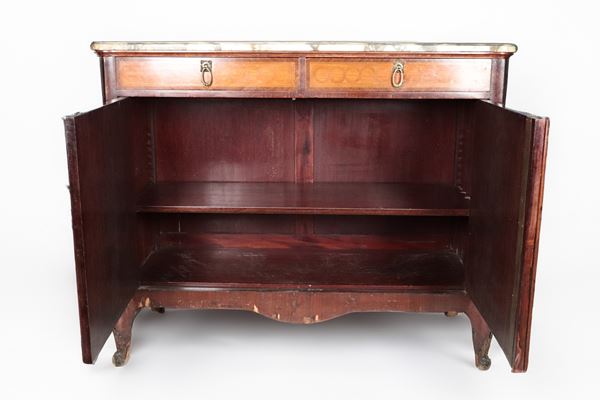 French sideboard in mahogany, rosewood and purple ebony, two drawers with two doors underneath and a white brecciated marble top