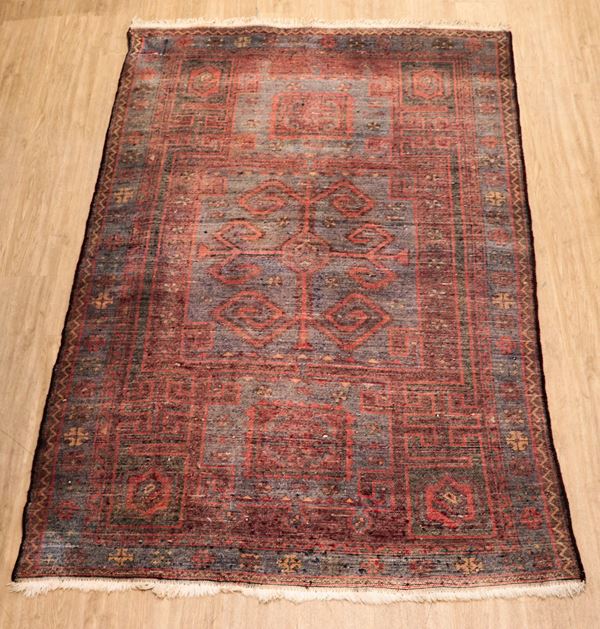 Kazakh Persian carpet with geometric designs on a red and light blue background