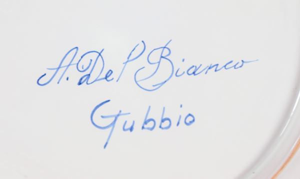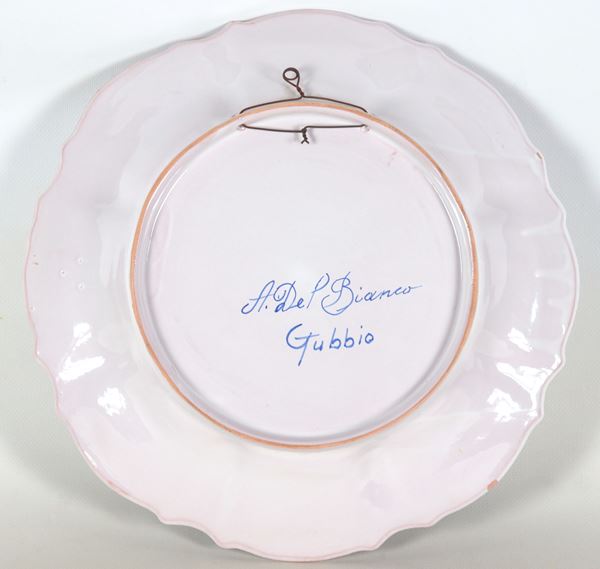 Large wall plate in Gubbio majolica with blue floral scroll decorations, "Knight with armour" in the centre