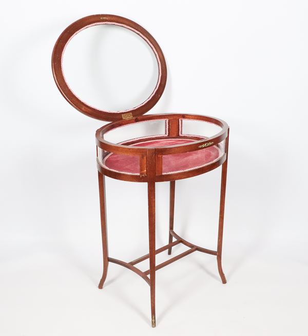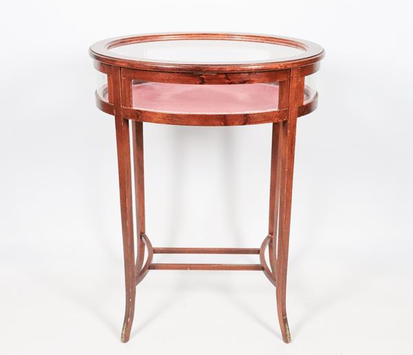 Oval center table in mahogany, with fold-down top and four curved legs joined by a crosspiece