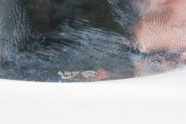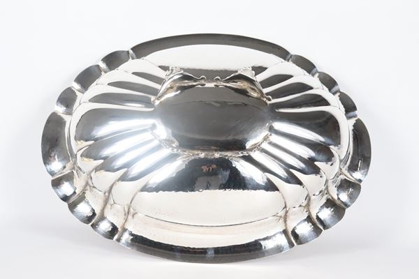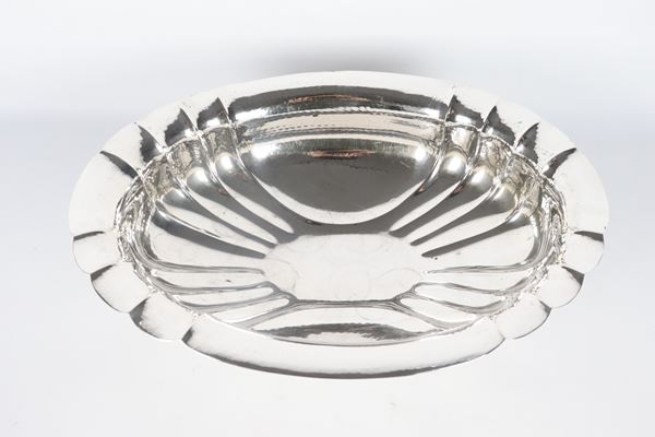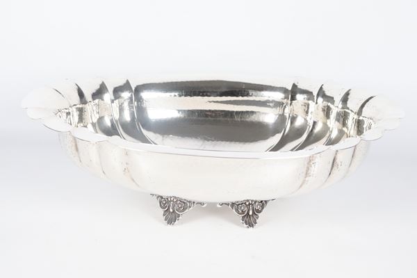 Oval centrepiece in chiseled and embossed silver, with arched edge and supported by four curved feet, gr. 1240