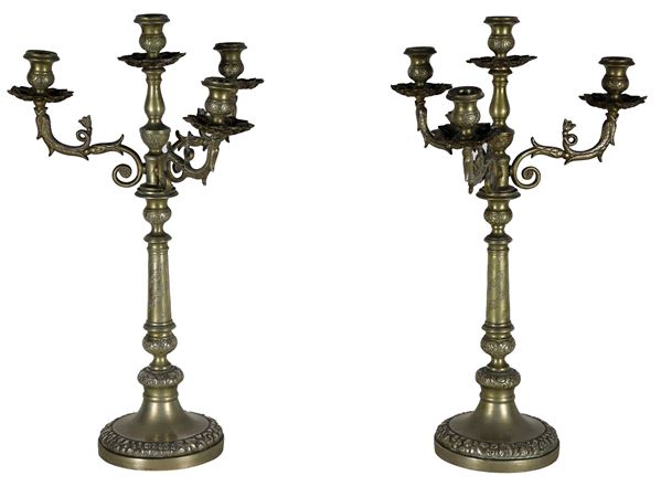 Pair of candelabra in silver-plated metal, embossed and chiselled with Empire motifs, 4 flames each