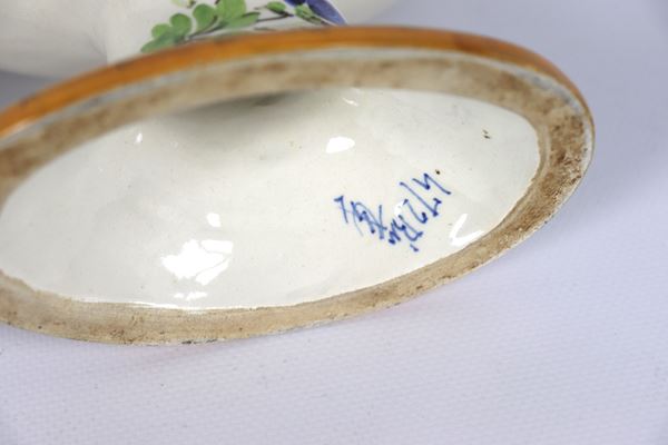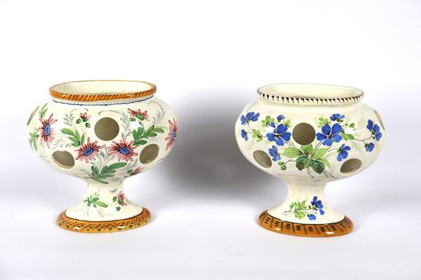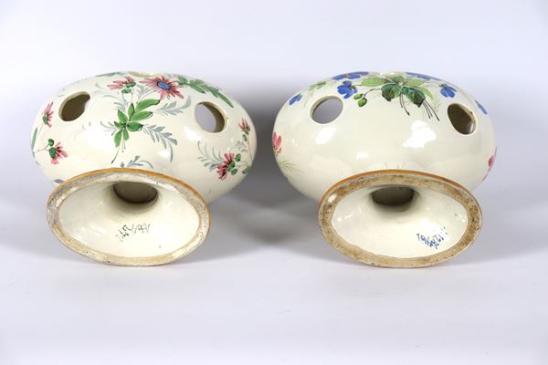 Pair of oval vases in Italian glazed ceramic, decorated with bunches of polychrome flowers, probably used for orchid bulbs. 1930s-1940s
