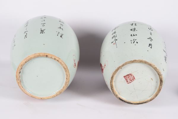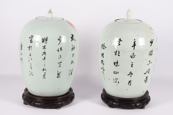 Pair of polychrome enamel vases depicting Pho dogs and inscriptions, with teak bases. China, Qing Dynasty, 19th century