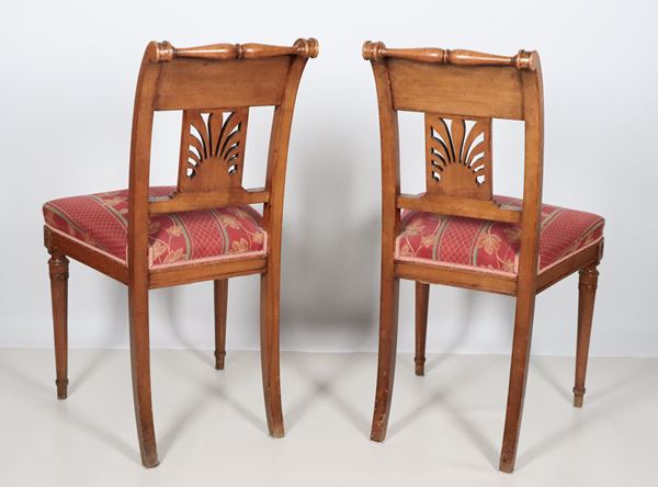 Pair of Tuscan chairs from the Carlo X line, in pickled wood with carved and perforated backrests, red floral fabric covering