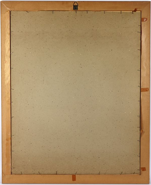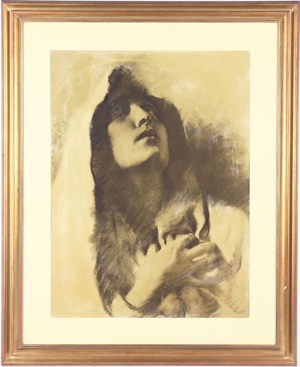 Signed. "Madonna in prayer", mixed media in golden frame and passepartout