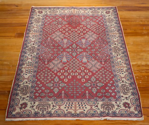 Persian Hamadan rug with geometric patterns on red background and white border