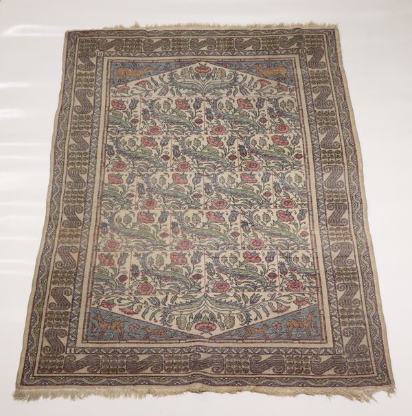 Persian rug with floral design on a brown and green background
