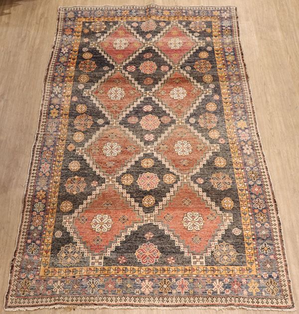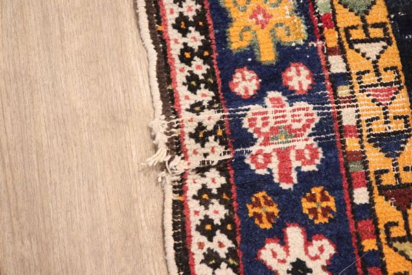 Persian Shiraz carpet with geometric designs on a blue background, various defects
