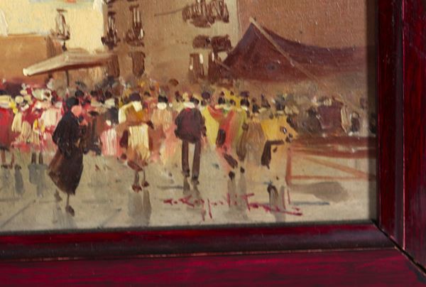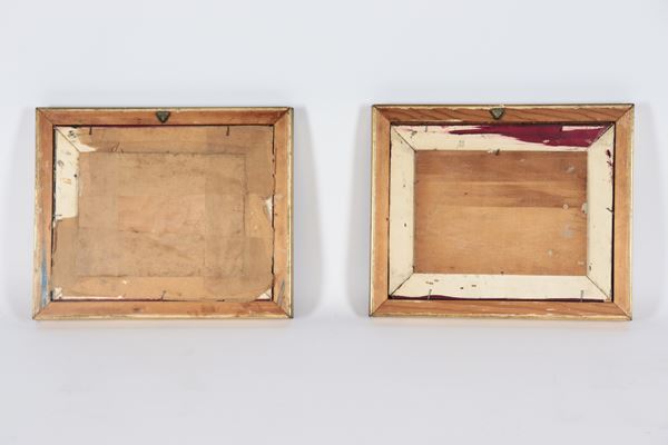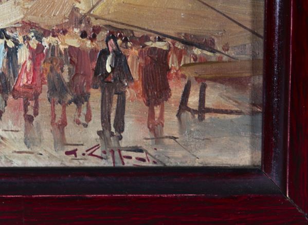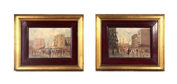 Signed. "Neapolitan local market", pair of small oil paintings on plywood, gilded wood and walnut frames