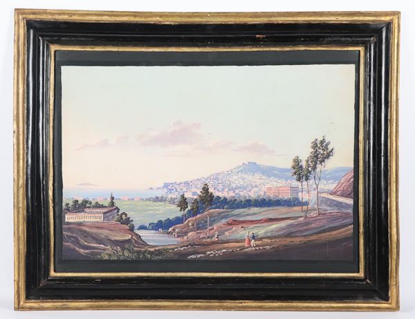 "View of Naples with Capodimonte", bright Neapolitan gouache in an ebonized wooden frame with gold profiles