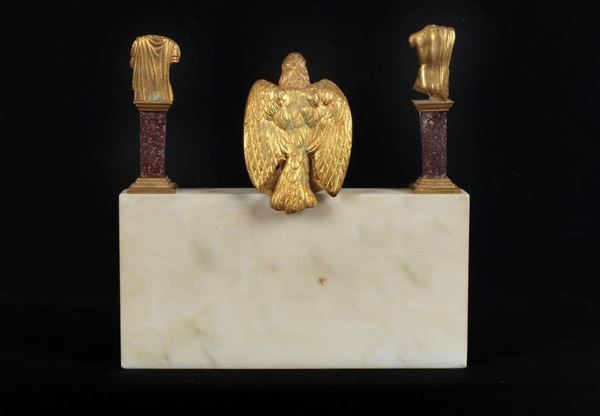 Roman frontispiece in white marble and porphyry, with eagle and Roman busts in gilded and chiseled bronze