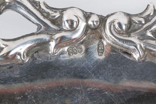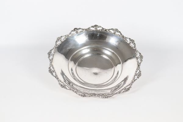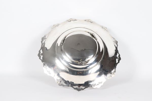 Round silver centrepiece, with chiselled, embossed and perforated edge, supported by three curved feet, 250g