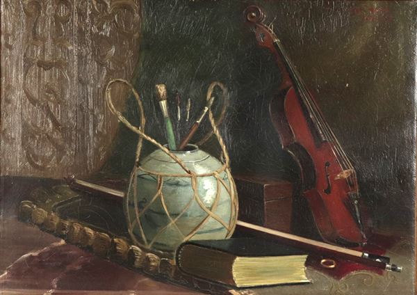 "Still Life with Violin, Vase and Brushes", oil painting on canvas in a gilded and carved wooden frame