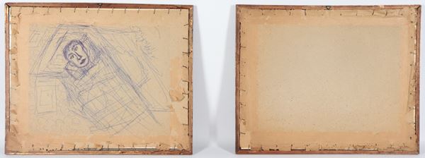 "Nomentano Bridge with Shepherd and Flock" and "Colosseum with Wayfarers", pair of small prints in gilded and carved wooden [..]