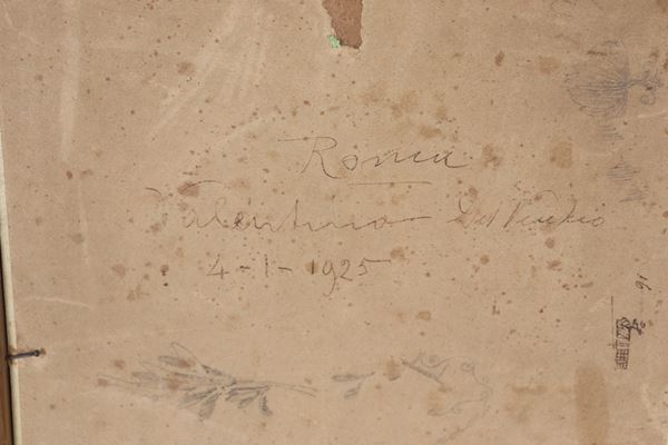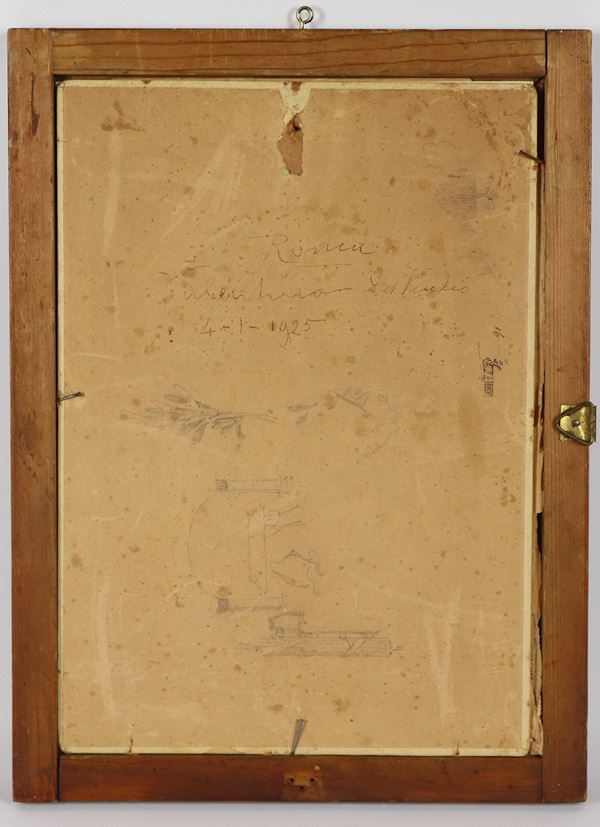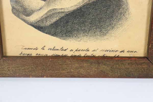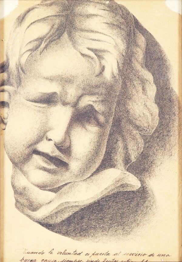 "Study of a putto's face", small charcoal drawing on paper, wooden frame. The paper has defects