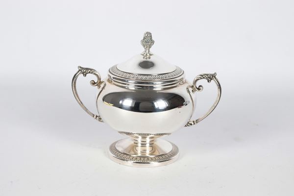 Silver amphora-shaped sugar bowl, with curved handles and pine cone-shaped knob, 180 g