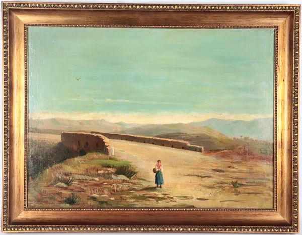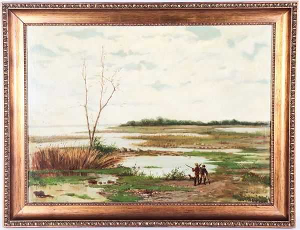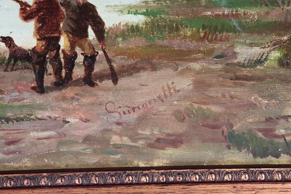 Signed. "Landscapes with Hunters and Peasant Woman on the Country Road", a pair of bright oil paintings on canvas in gilded and carved [..]