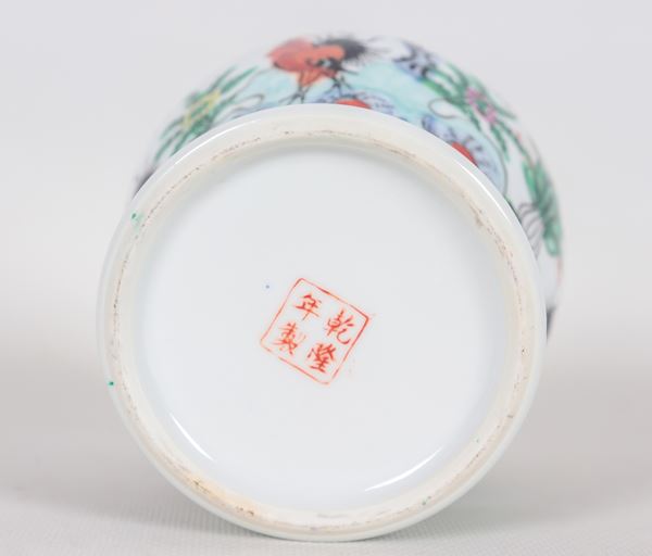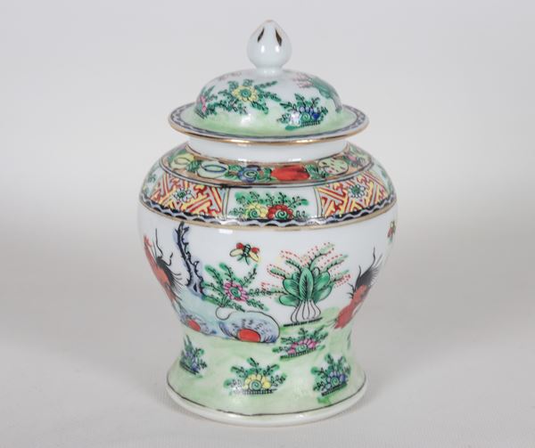 Small Chinese potiche in white porcelain with relief decorations in polychrome enamels with floral and bird motifs