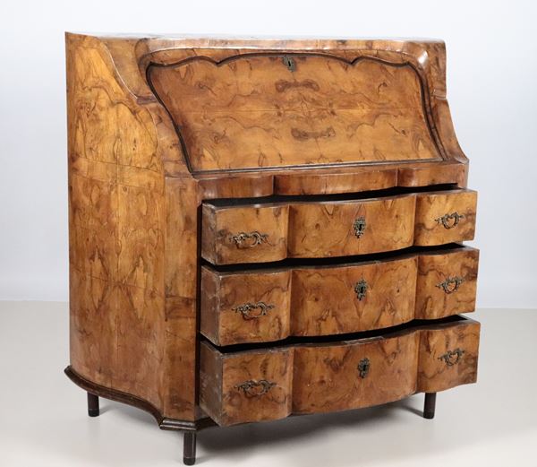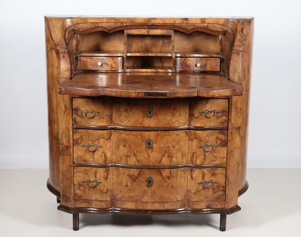 Venetian Louis XV style drop-leaf desk in walnut burl, with a drop-leaf forming a writing desk, three drawers underneath and four legs