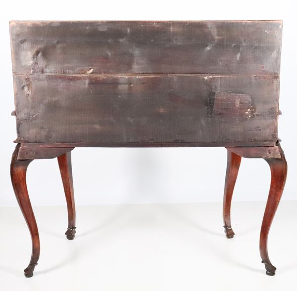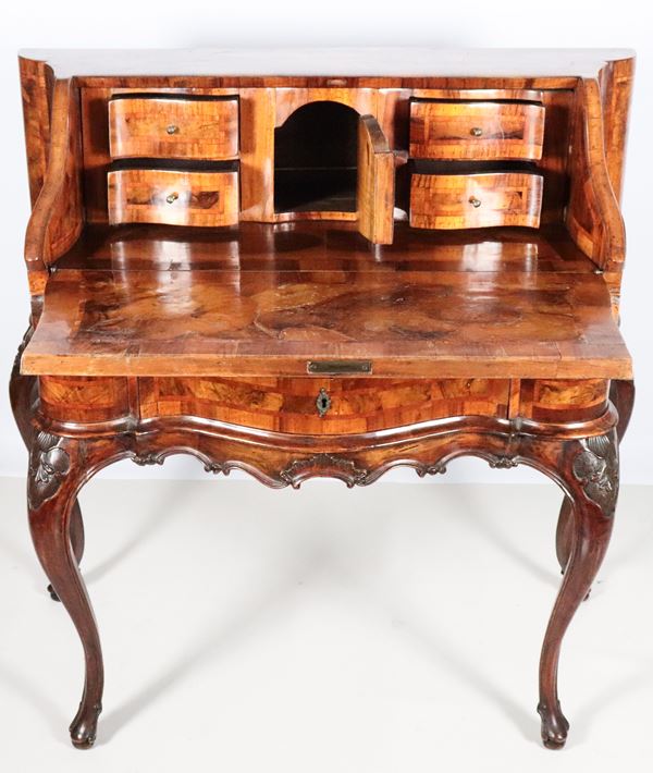 Venetian Louis XV style drop-leaf desk in walnut burl, with a drop-leaf forming a writing desk and drawers inside, a central drawer underneath [..]