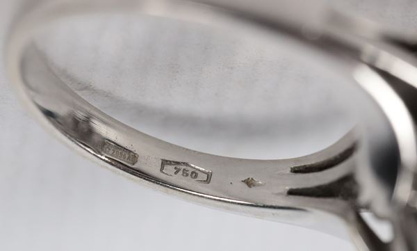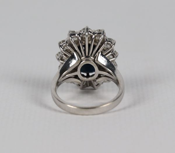 18kt white gold ring with oval sapphire surrounded by thirteen brilliant cut diamonds, approximately 1.30 ct, 8.9 gr.