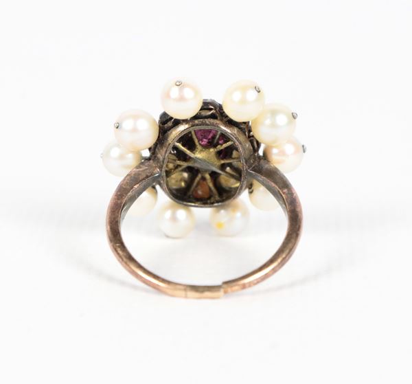 9kt gold and silver ring with pearls and a small central ruby. The ring needs to be re-soldered. Early 20th century manufacturing