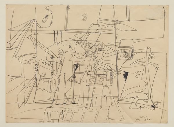 Signed and dated 1962. "Spettacolo", pencil drawing on paper, gilded wooden frame