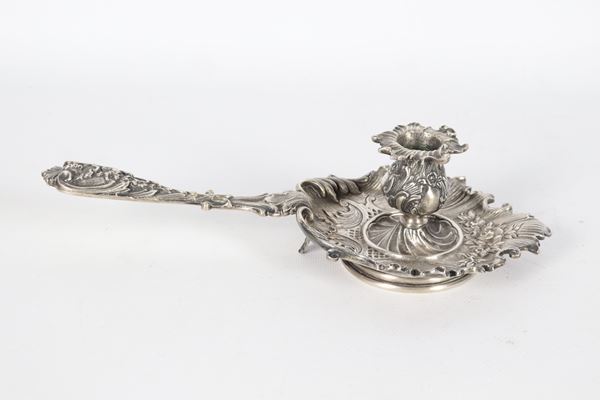 Ancient Roman silver-plated bronze candlestick, embossed and chiseled with Louis XIV motifs