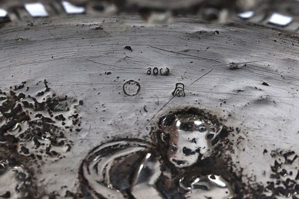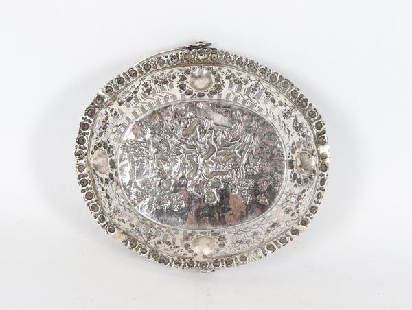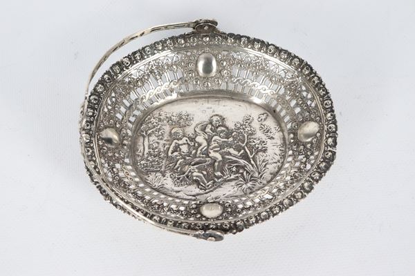 Antique basket in chiseled, embossed and perforated silver, with a bacchanalian background of cherubs, 130 gr.