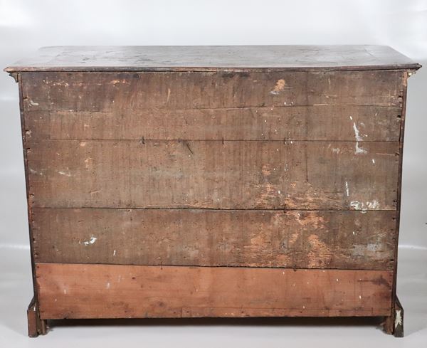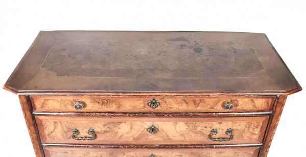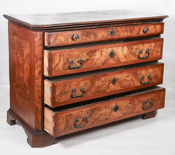 Antique Bolognese chest of drawers in Louis XIV style, in walnut and walnut root with inlaid threads, bronze escutcheons and handles, four drawers [..]