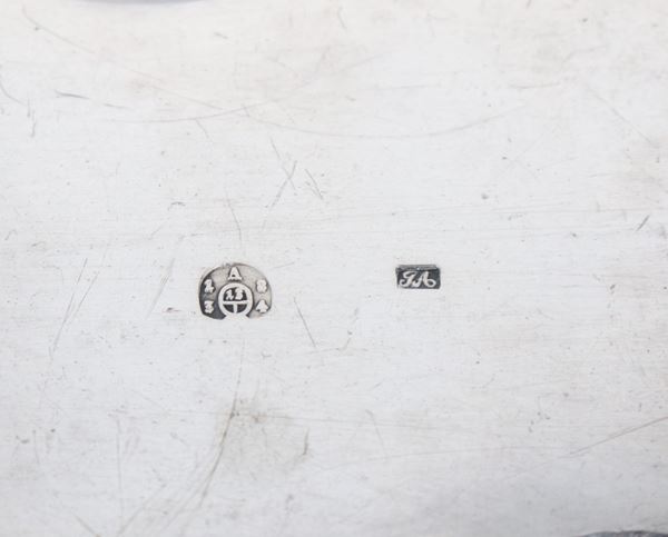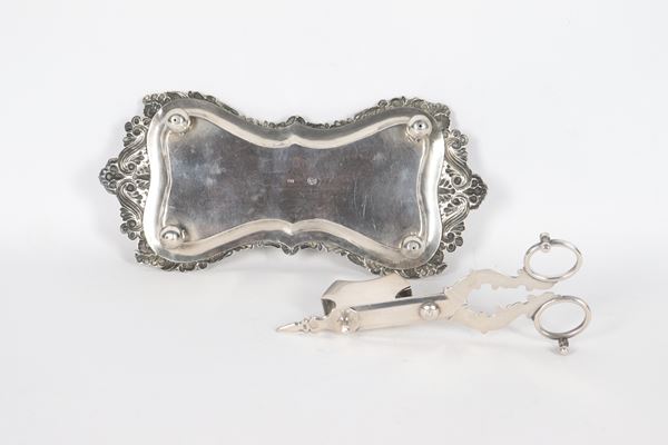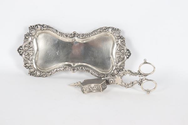 Antique candle snuffer in chiseled and embossed silver, scissors and shaped tray, gr. 276. Austro-Hungarian stamps 1834