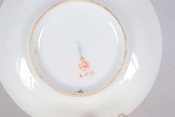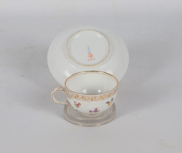 Antique cup and saucer in German porcelain Berlin KPM, with polychrome decorations of bunches of flowers and pure gold. Manufacture Late 19th [..]