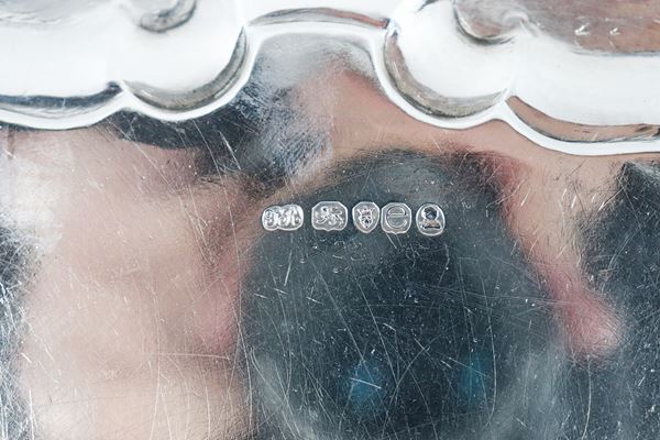 Antique English silver salver, George IV era, with a shaped and chased edge with scroll and shell motifs, supported by three curved feet. London [..]