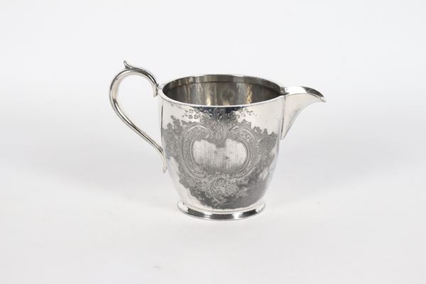 Antique English Victorian milk jug, in chiseled and embossed Sheffield with floral scrolls