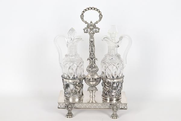 Antique French silver oil cruet, entirely chiseled and embossed with Empire motifs of swans, cherubs and intertwined cords, supported by four [..]