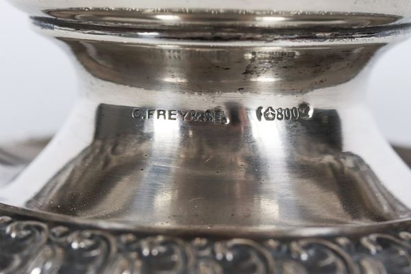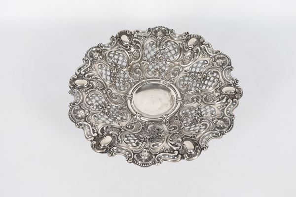 Antique German silver basket, entirely chiseled, embossed and perforated with floral interlacing and scroll motifs, 420 gr.