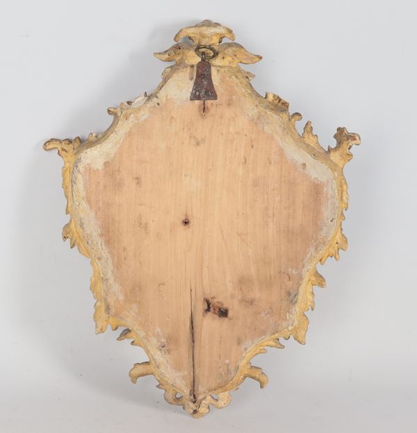 Antique holy water stoup in chiseled and embossed silver, in an antique gilded and carved wooden frame