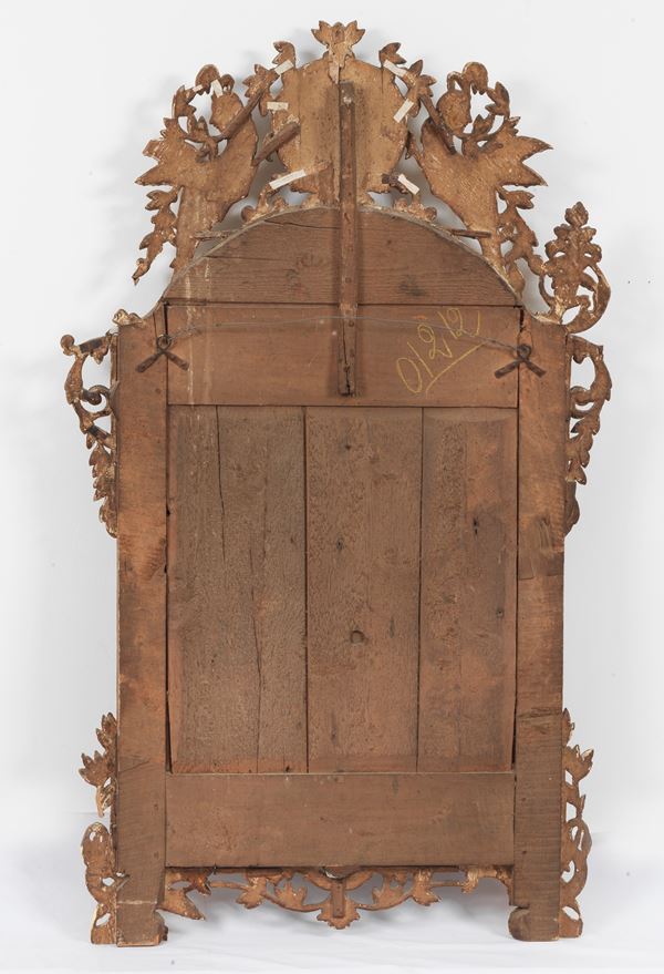 Antique large mirror in gilded wood and lacquered in fake marble, richly carved with vegetal scrolls, sculptures of harpies and medallion in [..]