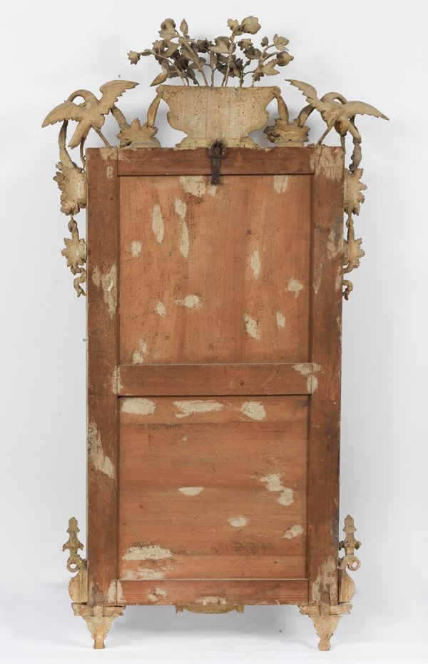 Antique Lucca mirror from the Directoire period, in lacquered and gilded wood with a carved top with a flower basket motif, sculptures of eagles [..]