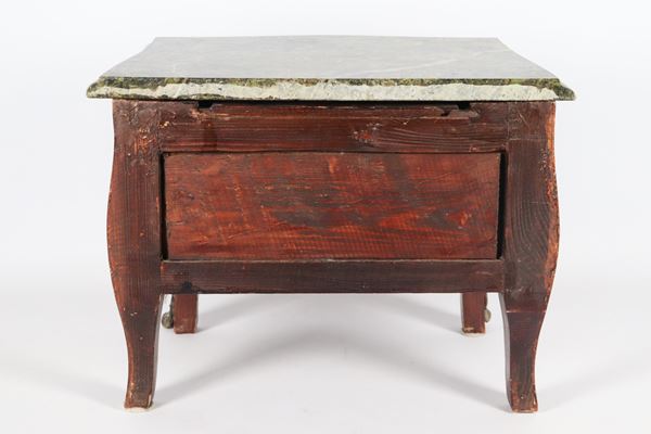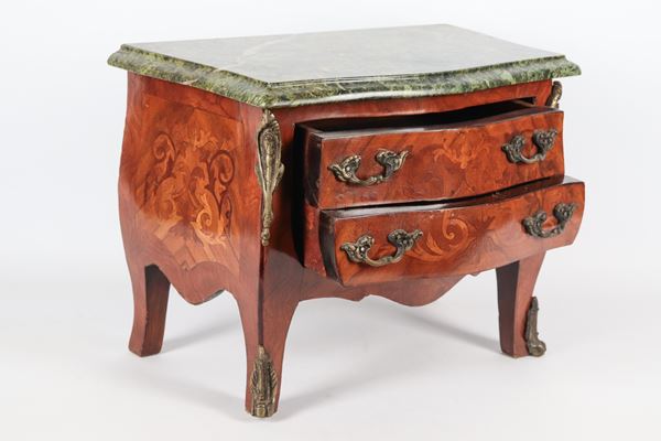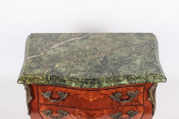 Antique model of a French Louis XV chest of drawers in rosewood, with floral scroll inlays, two drawers and a green marble top