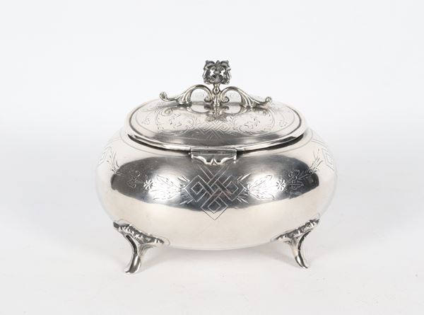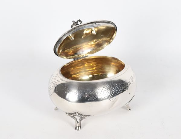 Antique Russian sugar bowl in chiseled and embossed silver, supported by four curved feet. Some dents, gr. 320. Stamped Moscow 1894