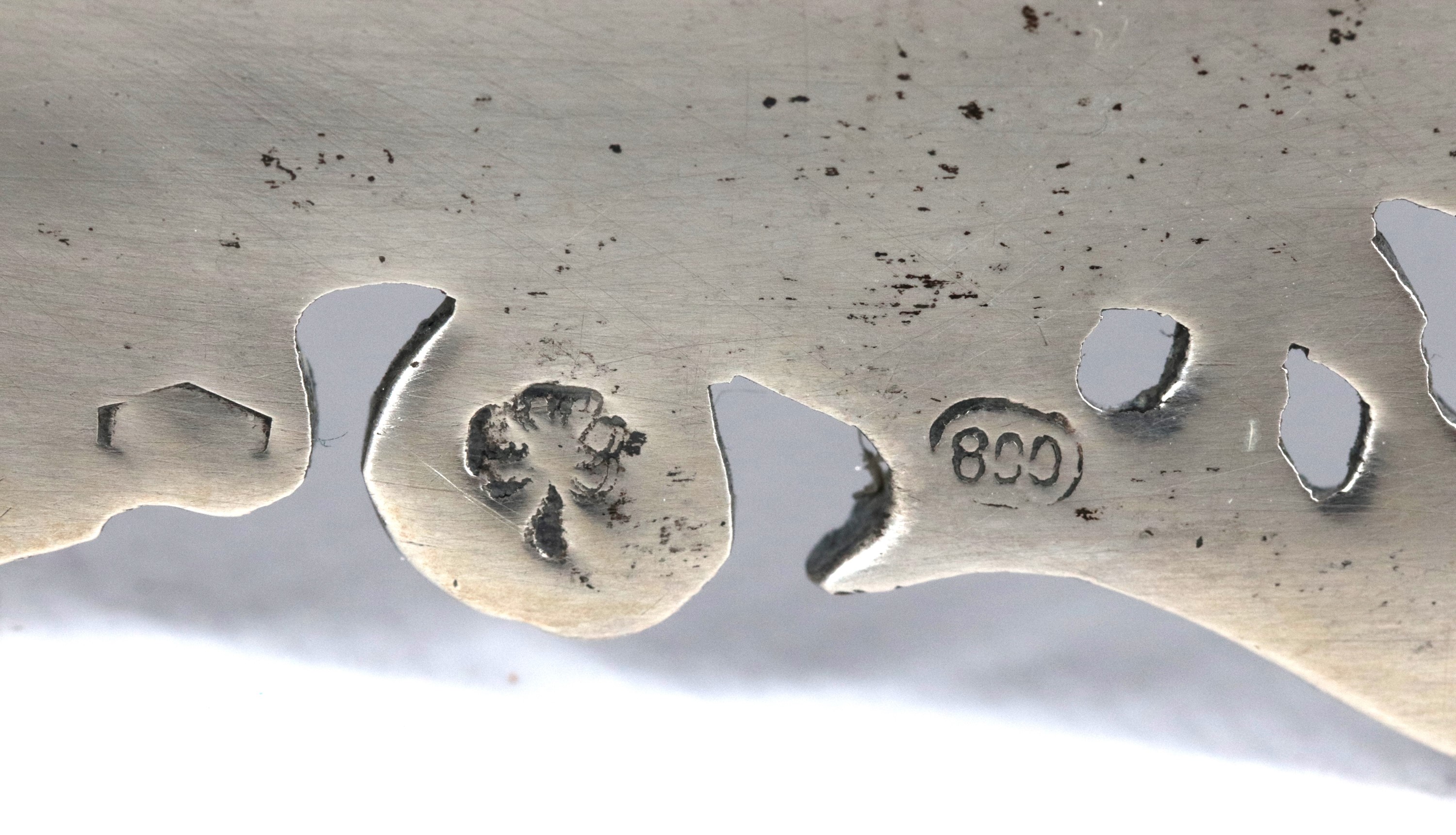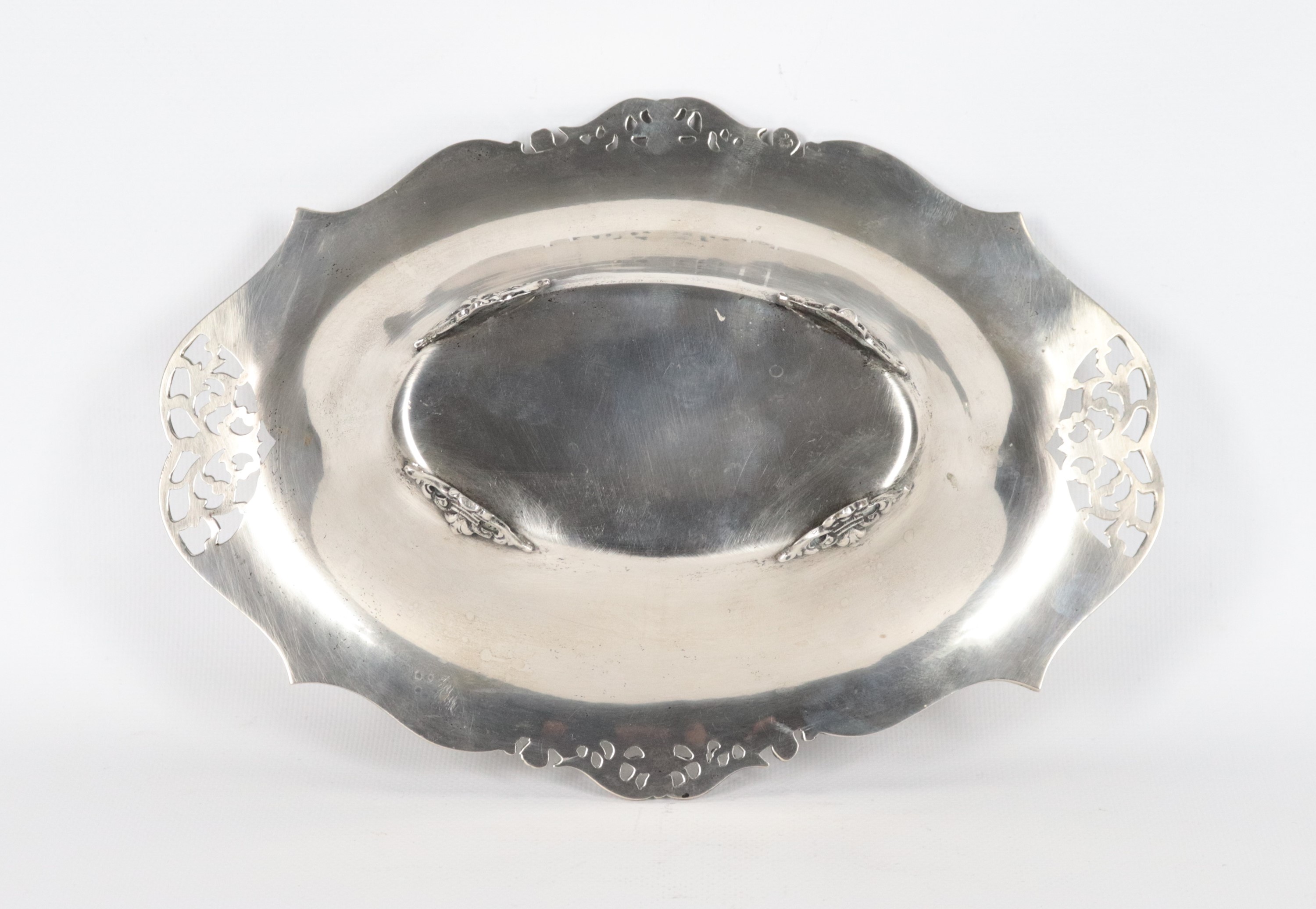 Antique small oval silver centrepiece, with chiselled, embossed and perforated edge, supported by four curved feet, 278 g